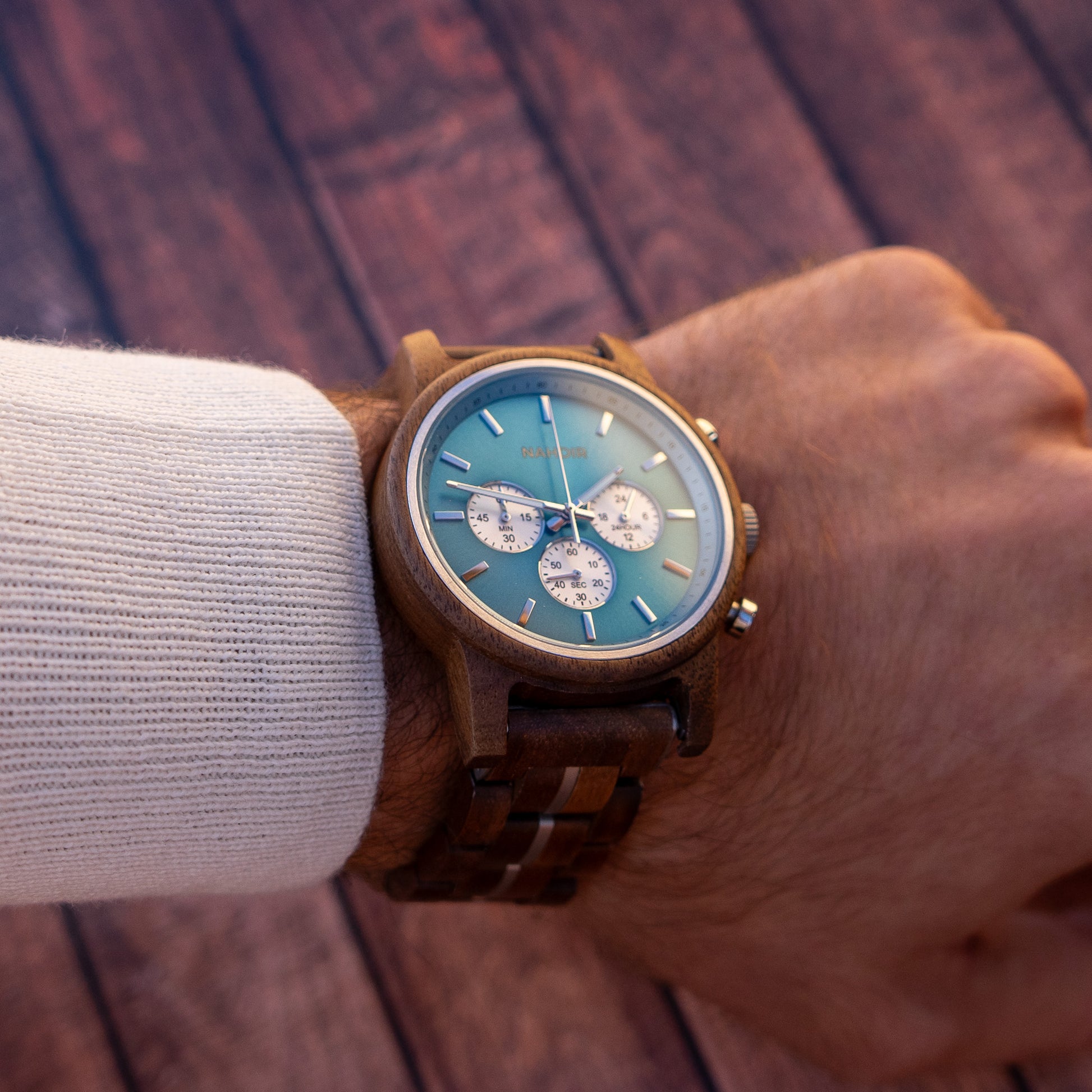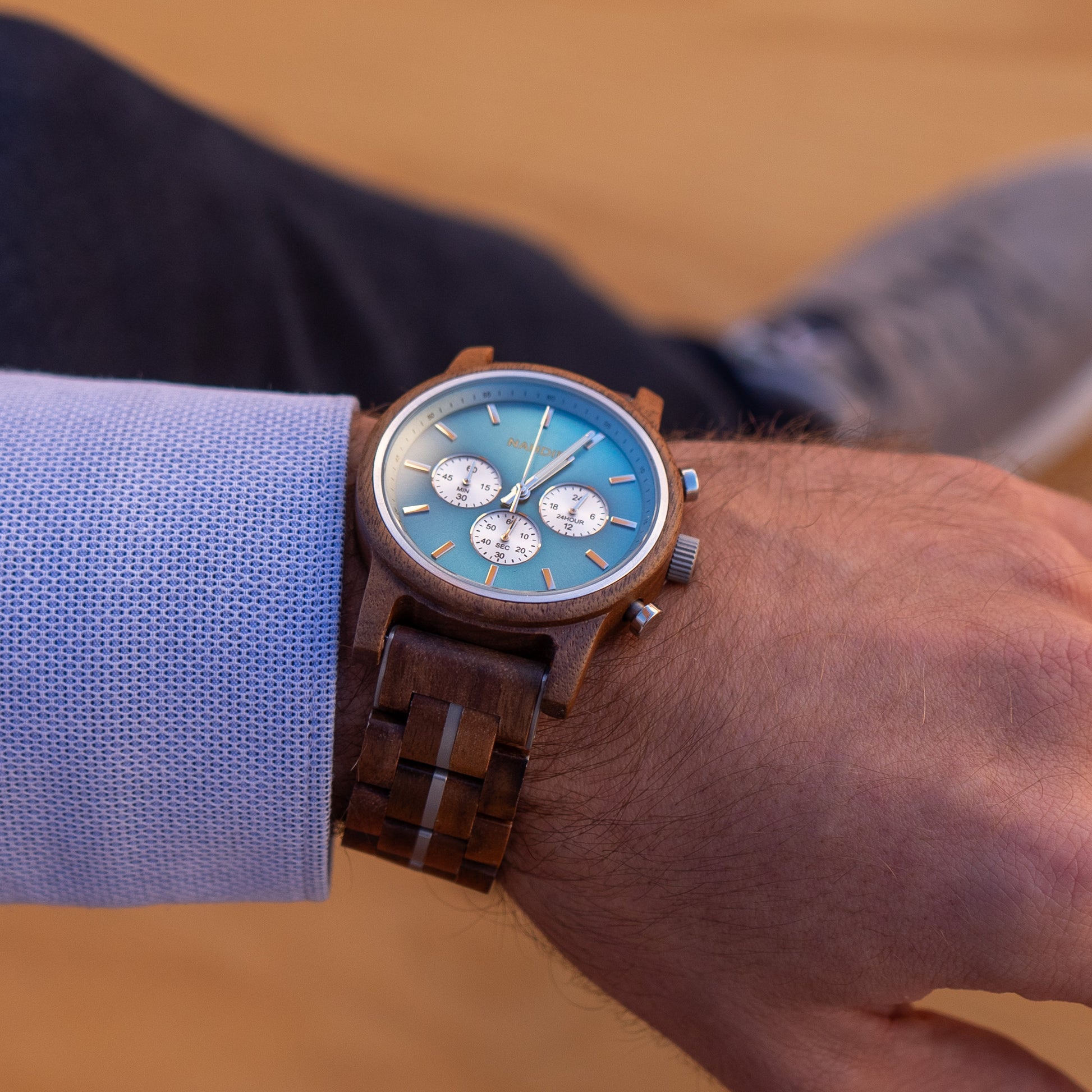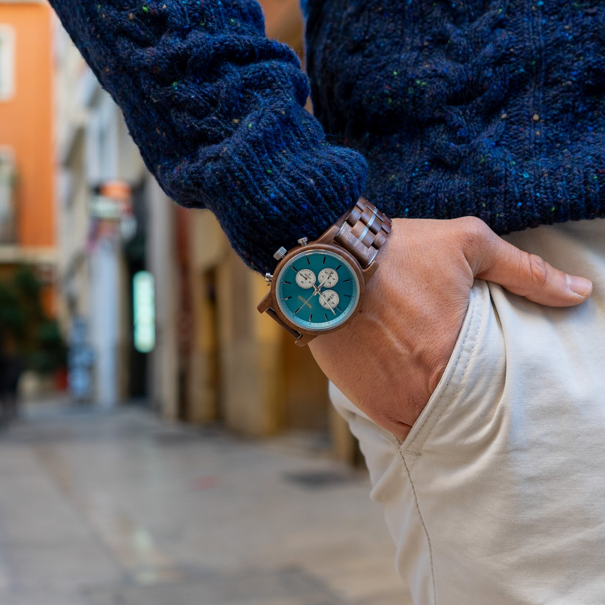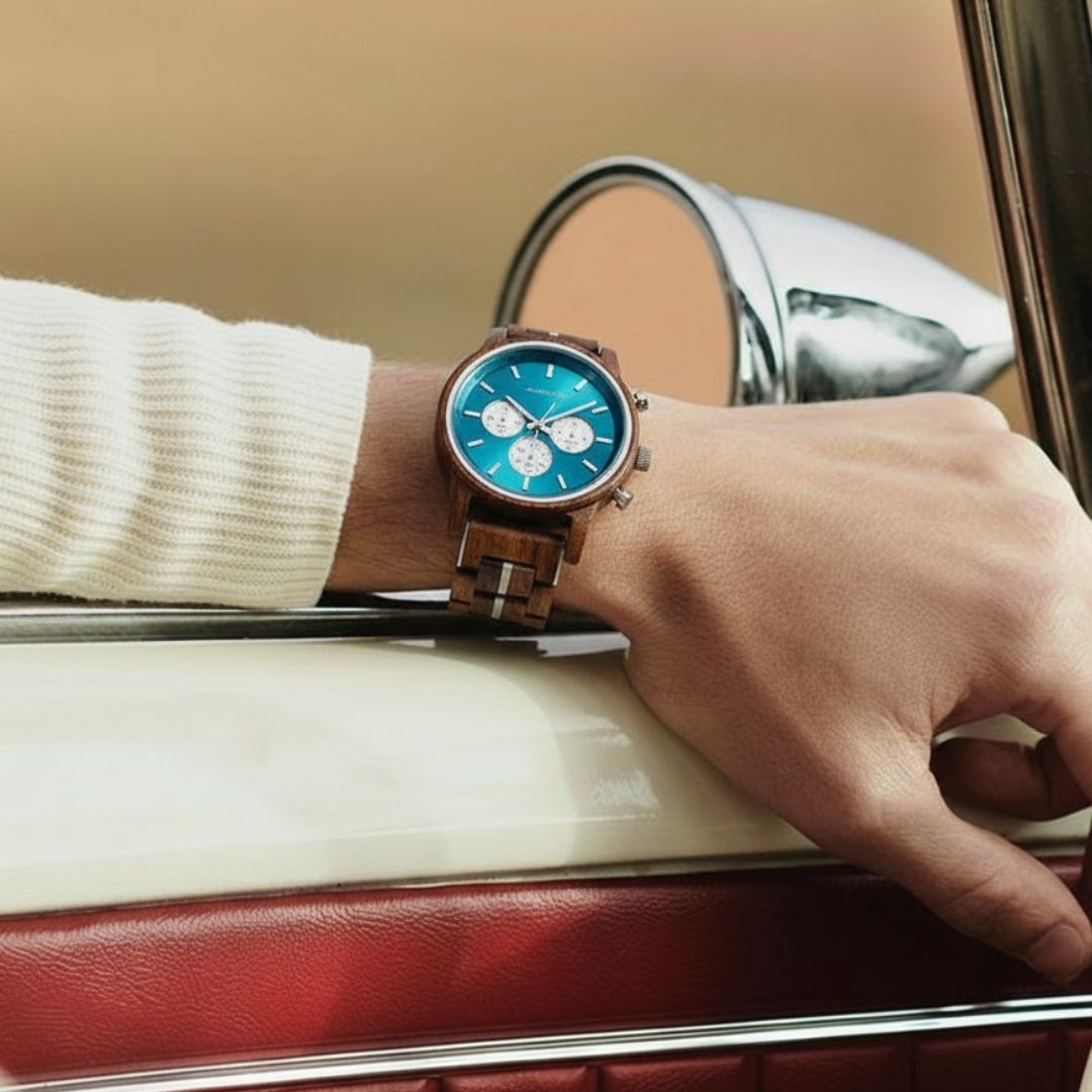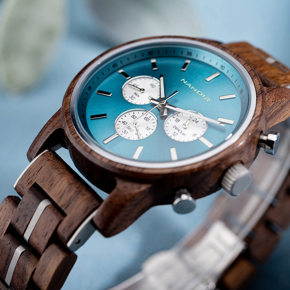 Diese Uhr ist nicht nur ein funktionales Objekt, sondern ein Kunstwerk, das Sie am Handgelenk tragen. Natürliches Walnussholz wird von Hand bearbeitet, um seine einzigartige Textur und Muster hervorzuheben, was zu einem unverwechselbaren und faszinierenden Design führt. Details in einem schönen Blauton sorgen für einen Hauch von Frische und Eleganz und schaffen einen optischen Kontrast, der ebenso markant wie harmonisch ist.