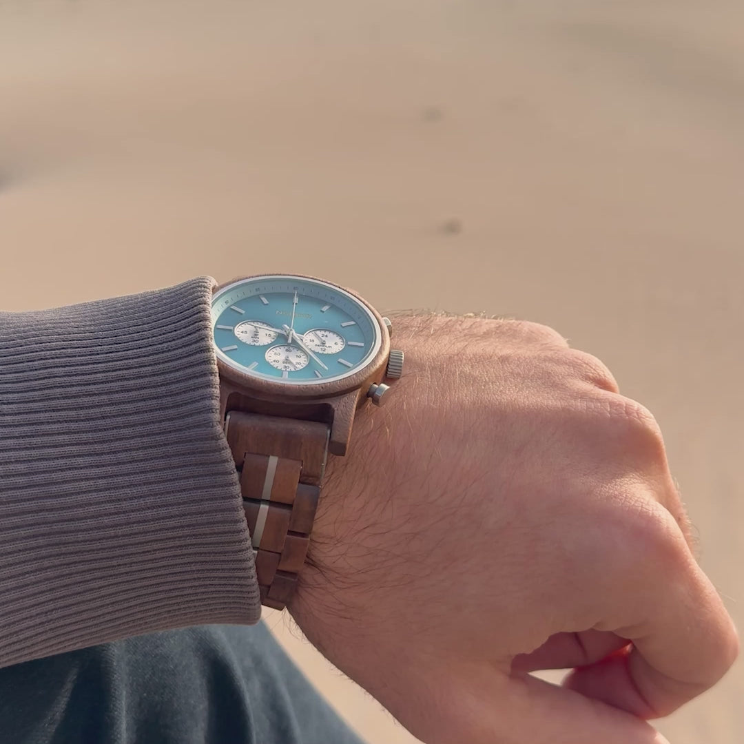 Die Nevada Wood Watch ist das perfekte Accessoire für alle, die natürliche Schönheit schätzen und bei ihren Accessoires einen Hauch von Originalität suchen. Mit ihrer Kombination aus natürlichem Walnussholz und blauen Akzenten ist diese Uhr eine ständige Erinnerung an die Schönheit und Gelassenheit der Natur.