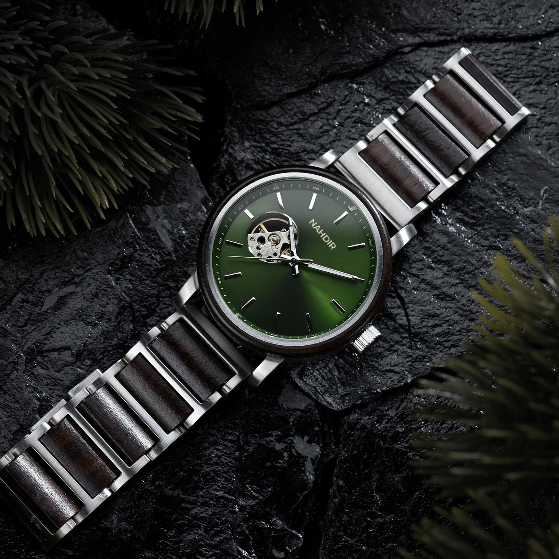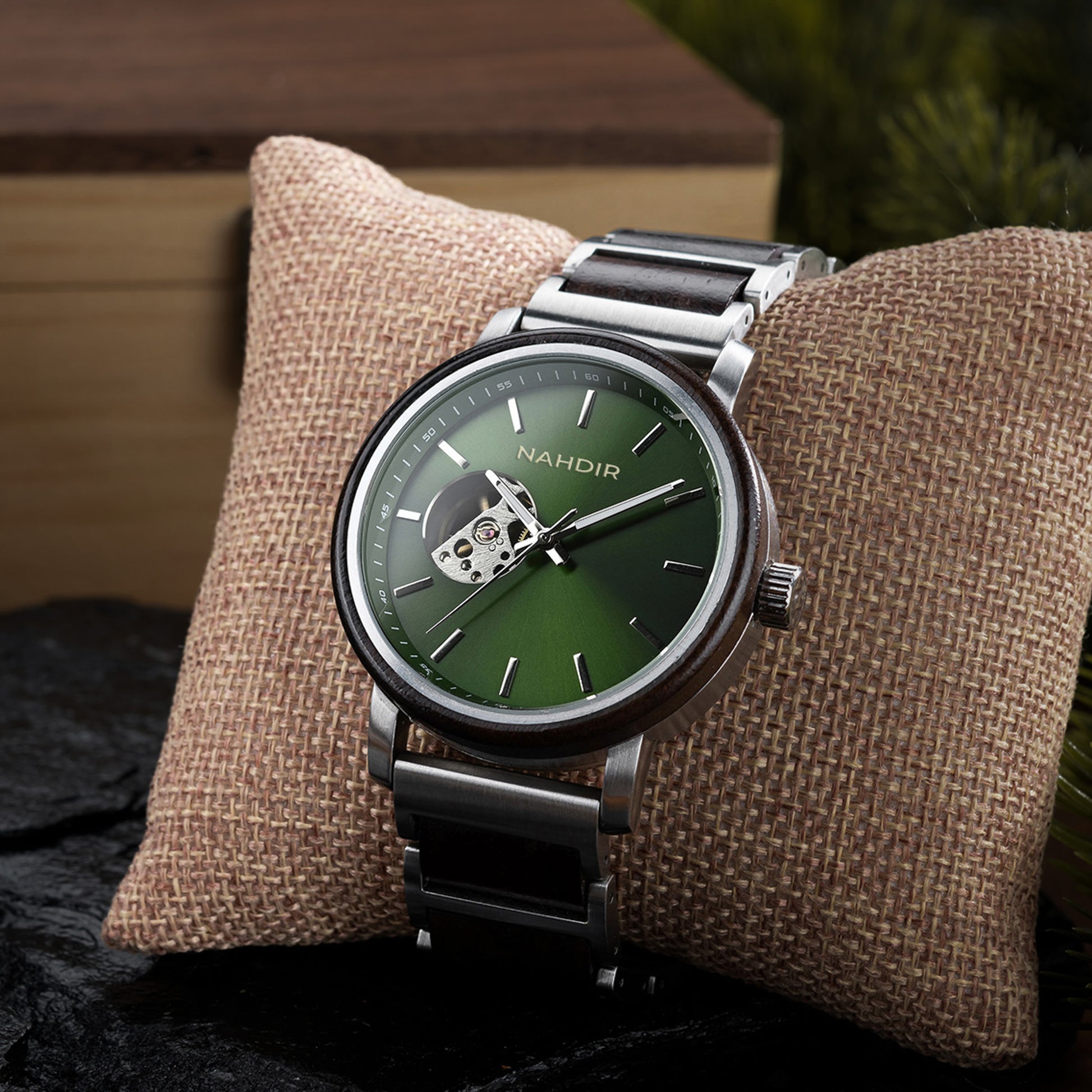 Realizzato a mano con legno naturale di ebano, la sua tonalità scura e profonda dona eleganza, solidità e una presenza magnetica inconfondibile. Ogni venatura è unica e contrasta perfettamente con l'acciaio argentato, creando un design moderno, sobrio e pieno di carattere. Il quadrante verde intenso aggiunge un tocco sofisticato, mentre la finestra aperta lascia vedere il cuore dell'orologio.