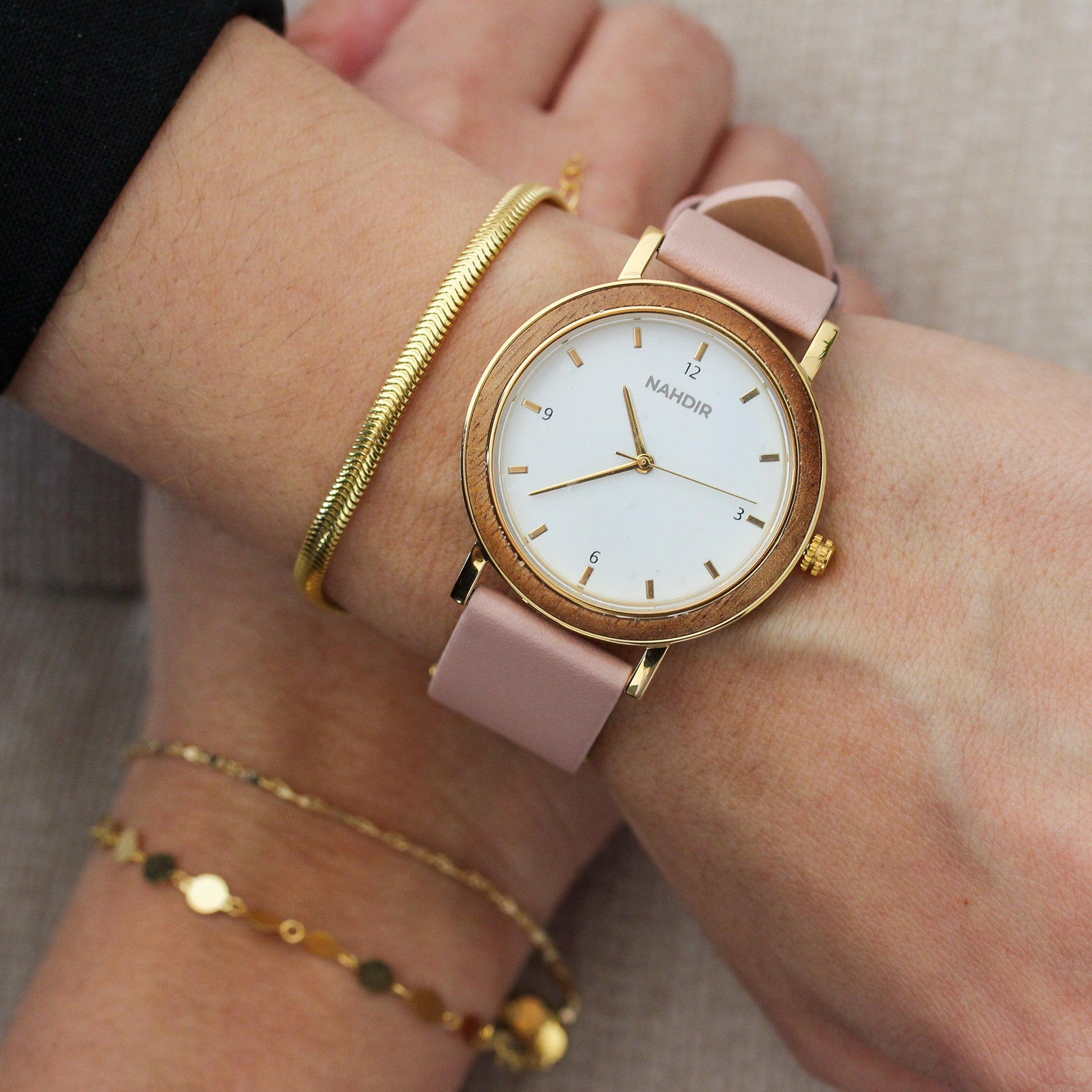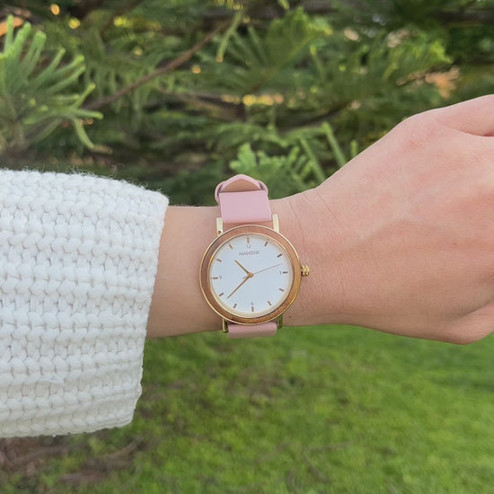 Il cinturino è realizzato in pelle genuina in una tonalità rosa tenue, offrendo comfort, leggerezza e uno stile femminile irresistibile. La cassa incorpora legno naturale, donando quel calore organico che ci contraddistingue e rendendolo un orologio delicato ma pieno di personalità.