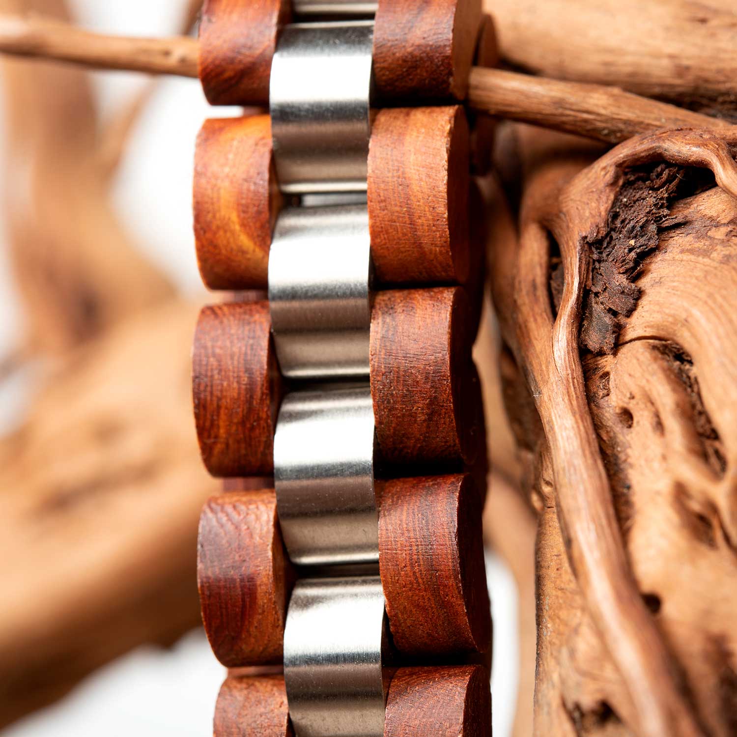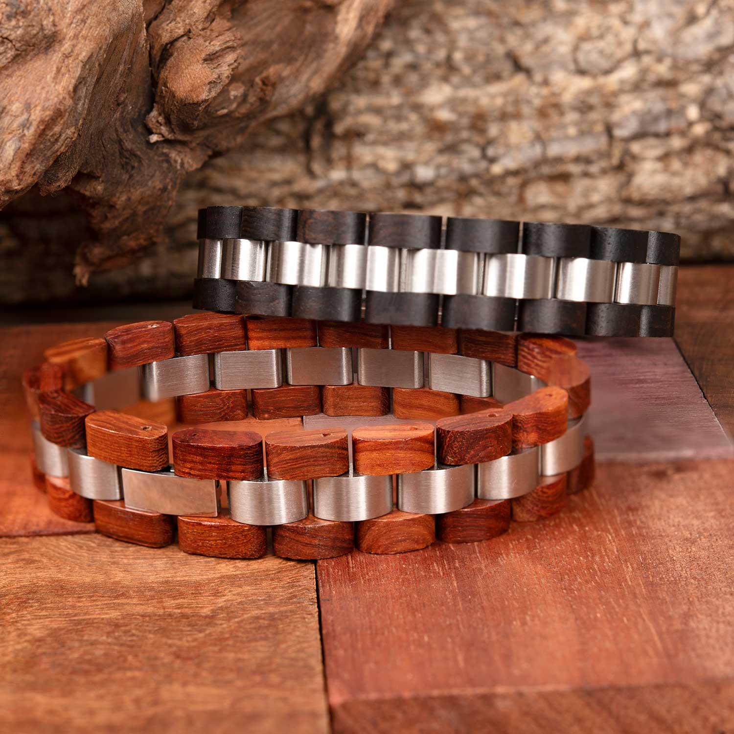 La combinación distintiva de madera y acero inoxidable en esta pulsera la hace sobresalir estéticamente.