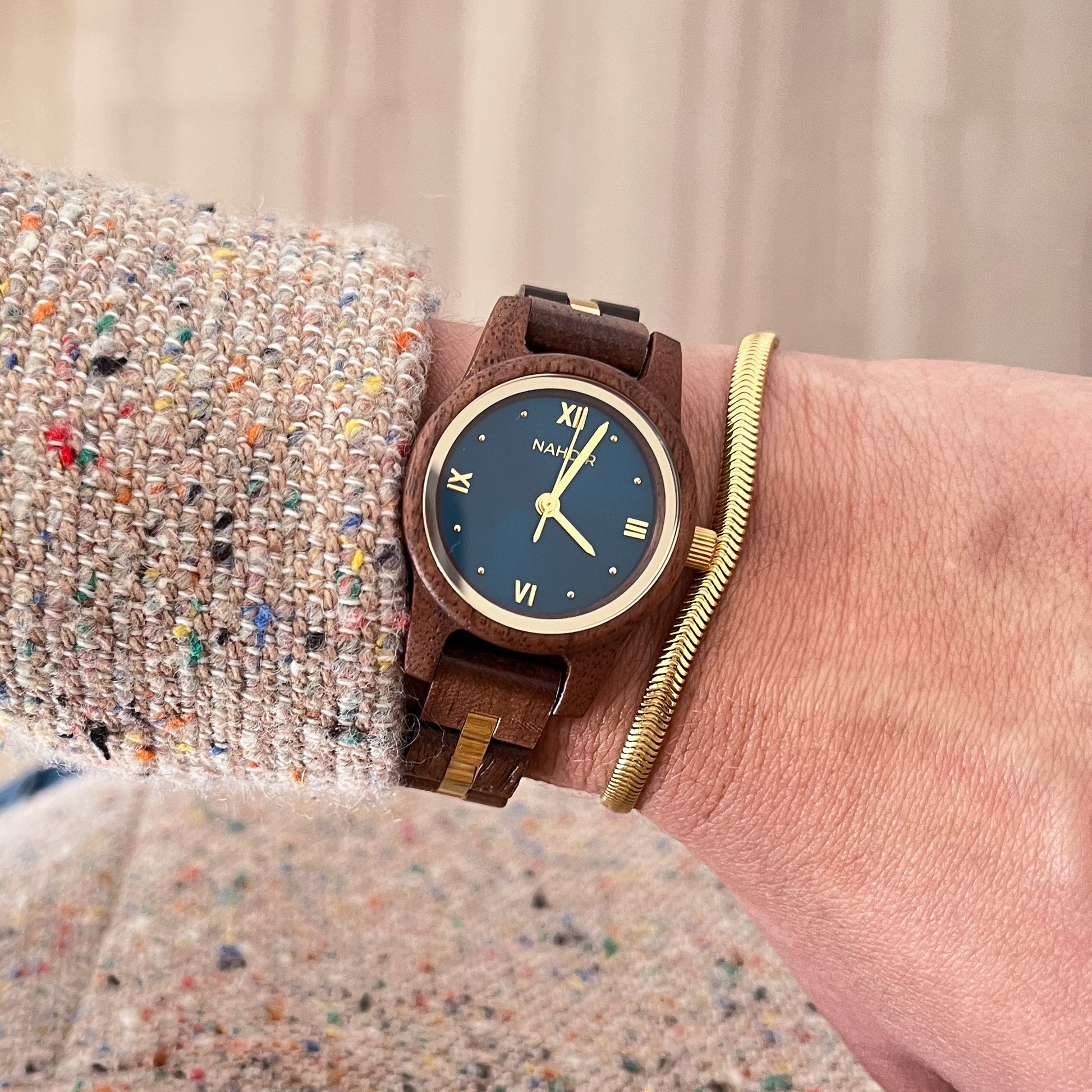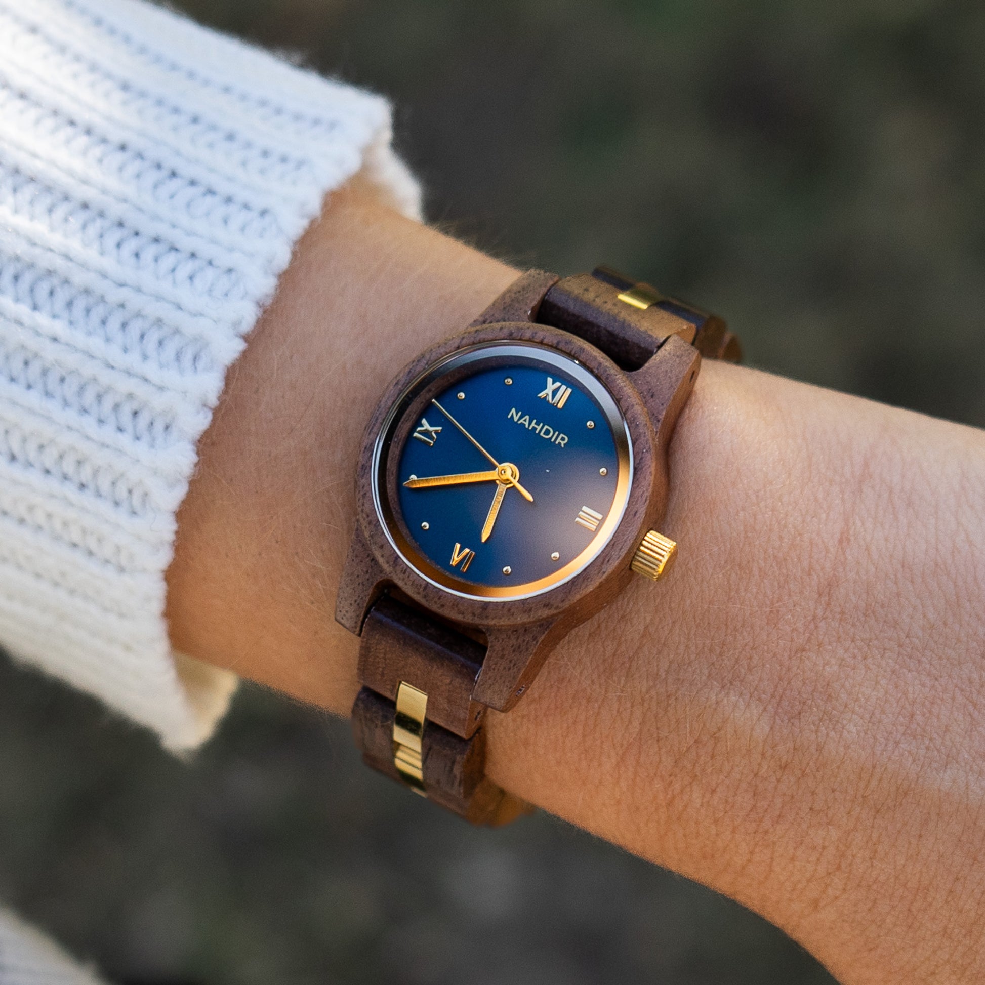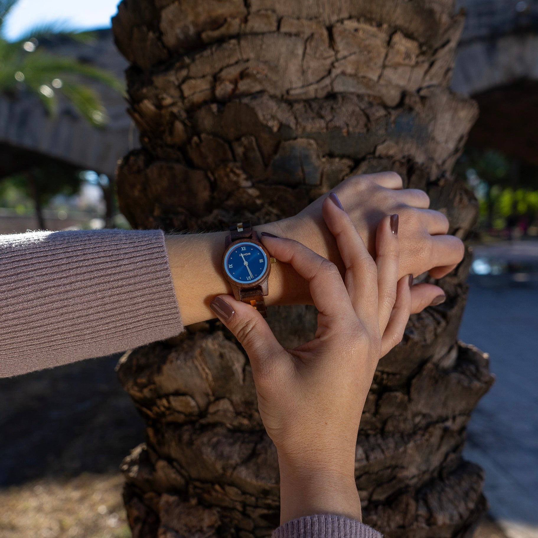California está elaborado a mano con madera de nogal natural, conocida por su calidez y sus vetas suaves que hacen que cada pieza sea única. Su esfera en azul profundo, acompañada de detalles dorados, crea un contraste delicado y luminoso que aporta frescura, elegancia y personalidad sin esfuerzo.