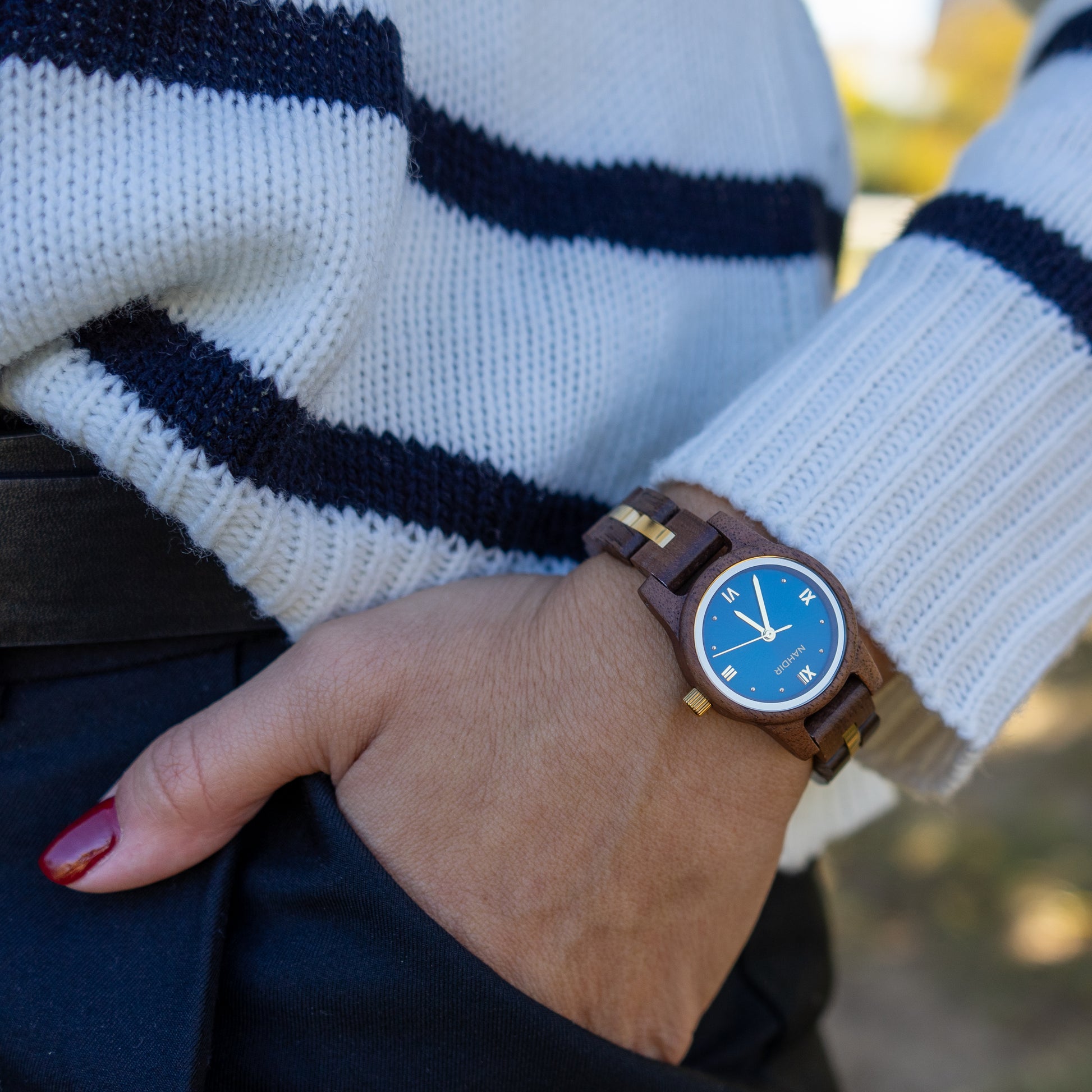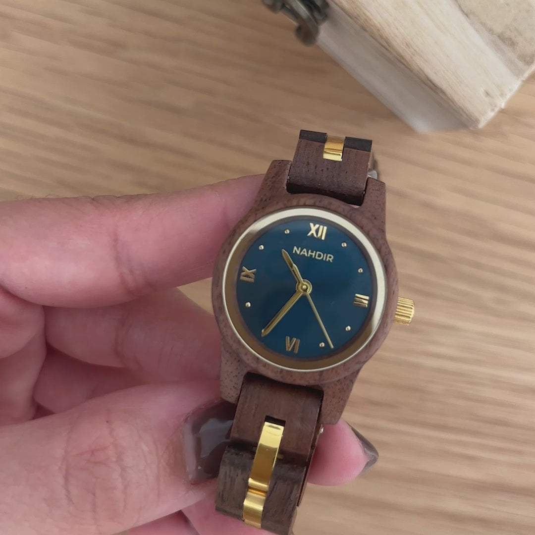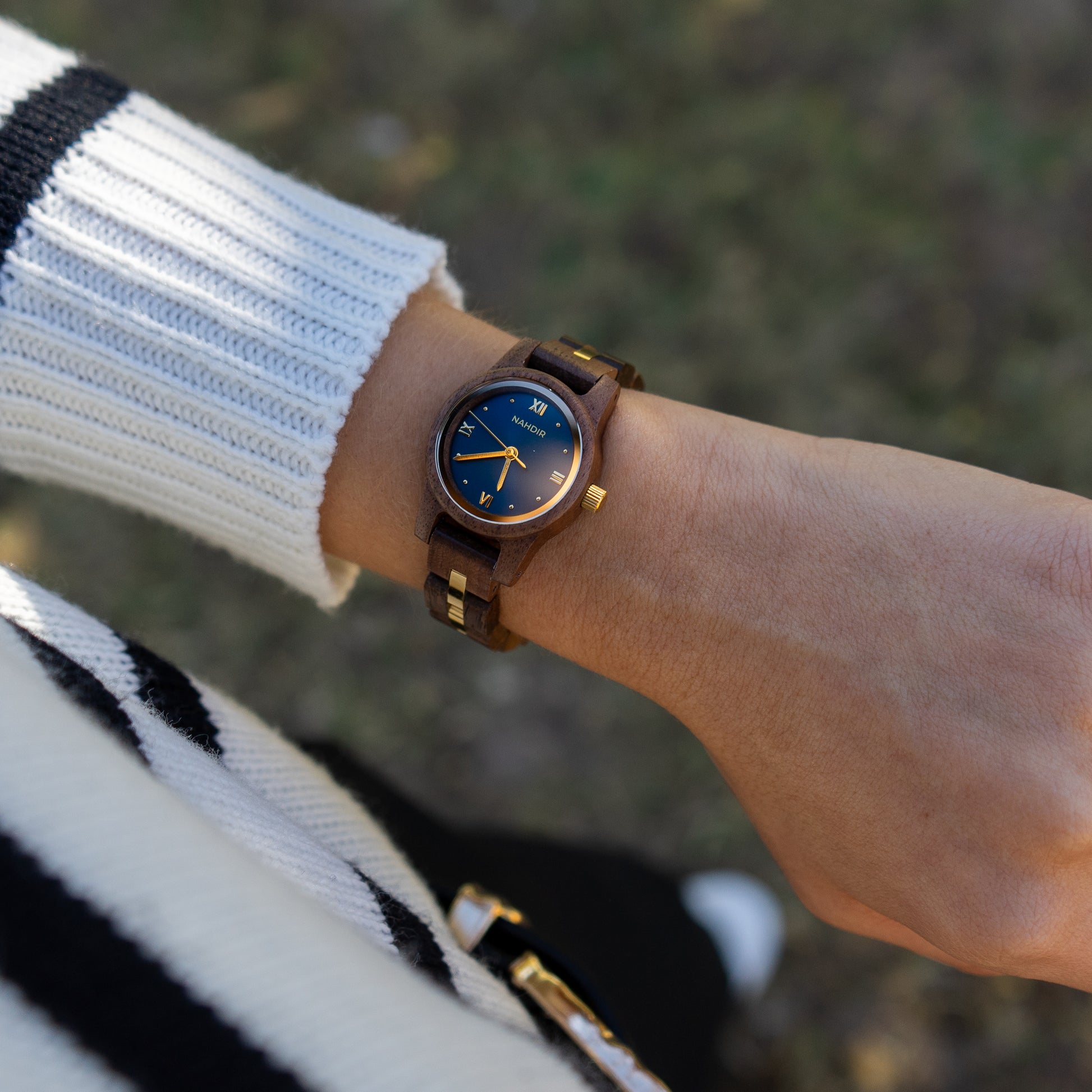 California está elaborado a mano con madera de nogal natural, conocida por su calidez y sus vetas suaves que hacen que cada pieza sea única. Su esfera en azul profundo, acompañada de detalles dorados, crea un contraste delicado y luminoso que aporta frescura, elegancia y personalidad sin esfuerzo.
