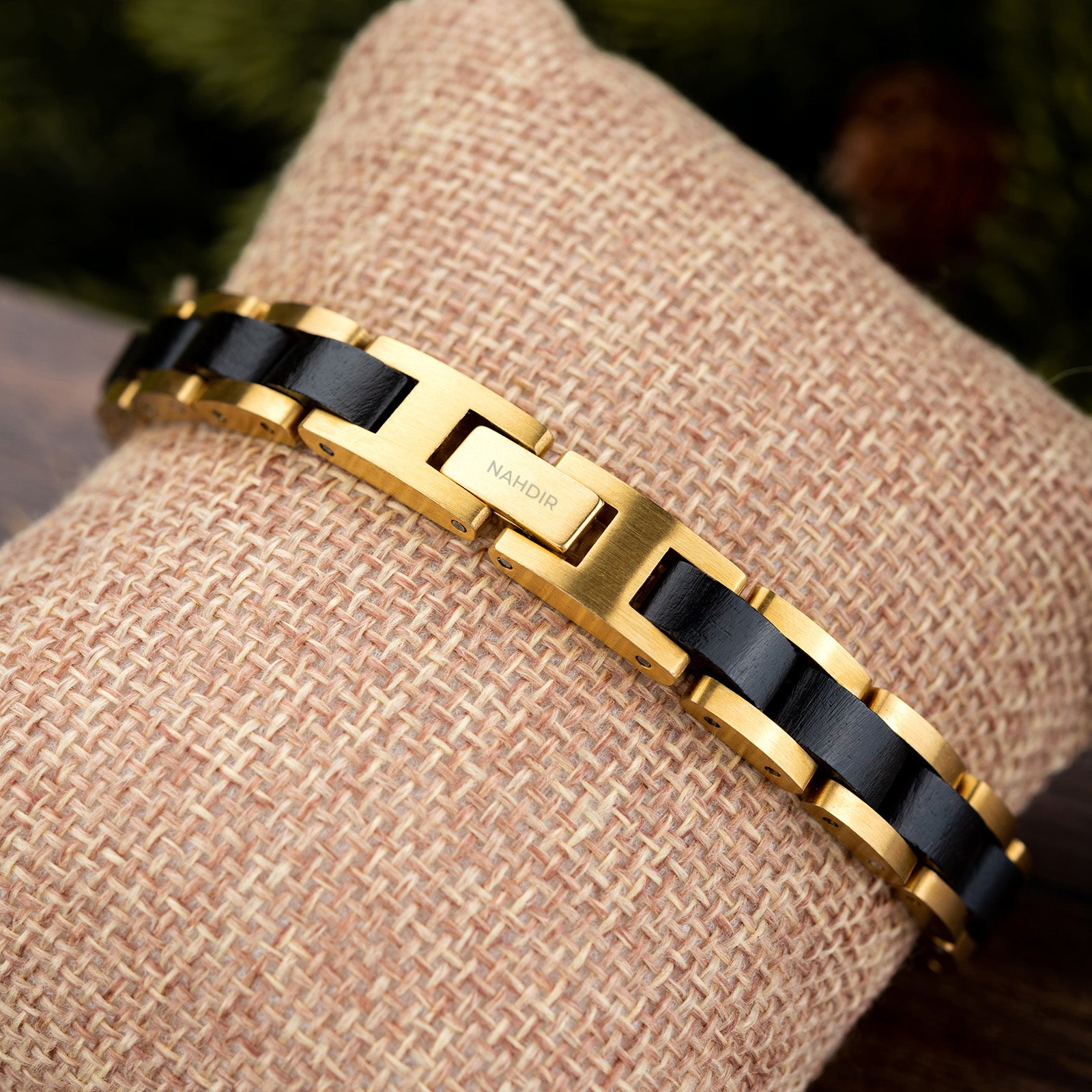 El acero inoxidable dorado añade un toque de lujo a la pulsera, elevando su diseño a nuevas alturas de sofisticación. Los detalles finamente pulidos y la tonalidad dorada crean un contraste deslumbrante con la madera de roble negro, aportando un brillo que no pasa desapercibido.