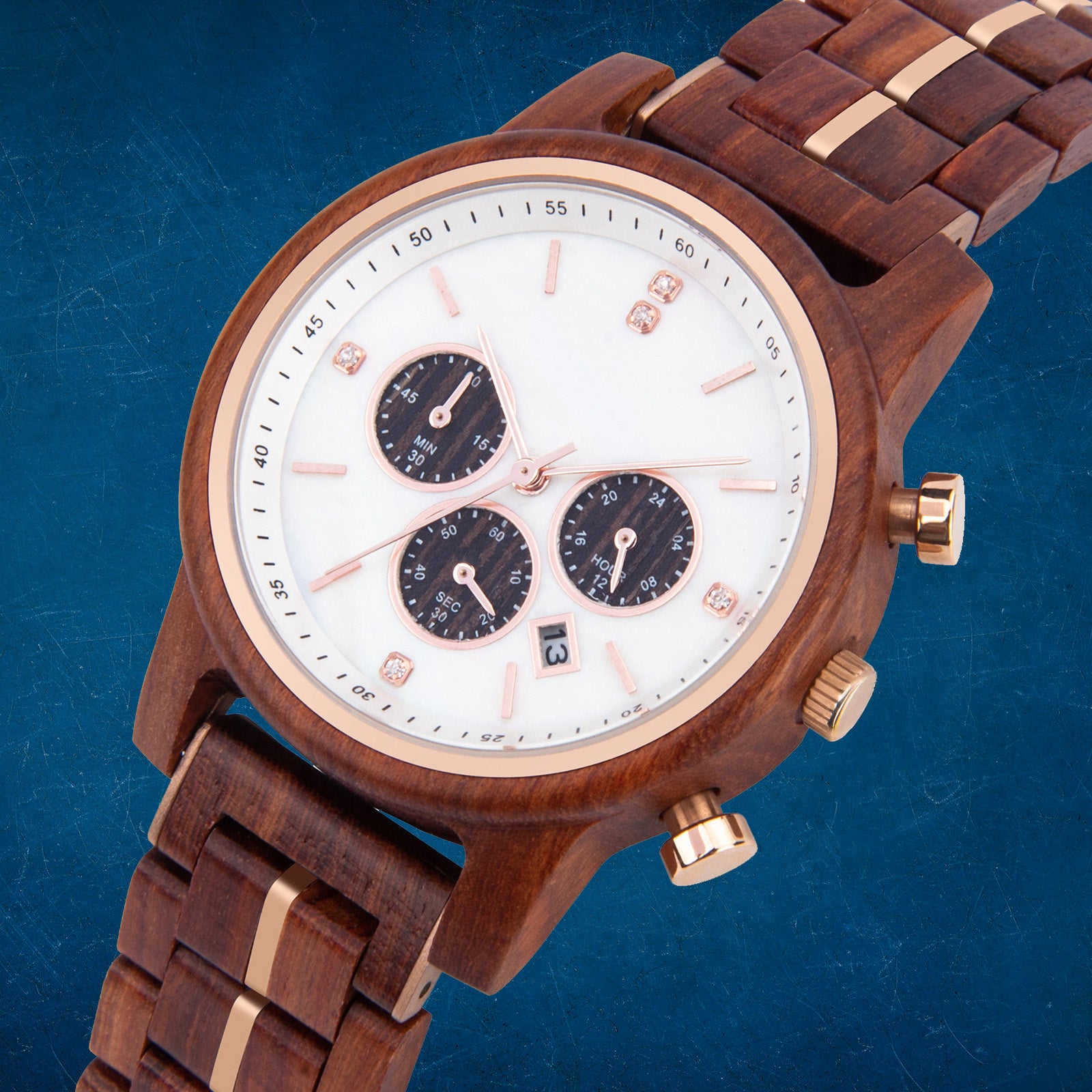Cada pieza es única, destacando las vetas y el tono natural de la madera, lo que garantiza que no haya dos relojes iguales.